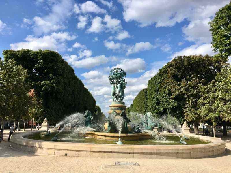 Varias estatuas adornan el jardín, pero la atracción principal es la fuente de las Cuatro Partes del Mundo. Construida en bronce entre 1867 y 1874, es una obra colectiva en la que participaron varios artistas. Coronada con un globo terráqueo sostenido por cuatro personajes que representan el continente africano, americano, asiático y europeo, esta fuente se adorna también con ocho caballos marinos, peces y tortugas.