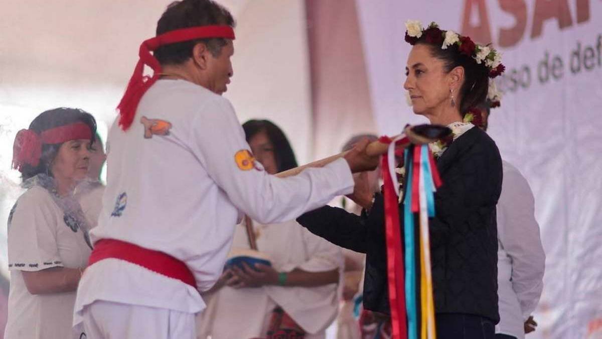 Al comienzo del evento, representantes de los pueblos originarios de Texcoco, otorgaron un reconocimiento a Sheinbaum Pardo por su trabajo a favor del pueblo con la entrega del bastón de mando de las comunidades, así como la realización de un ritual tradicional.