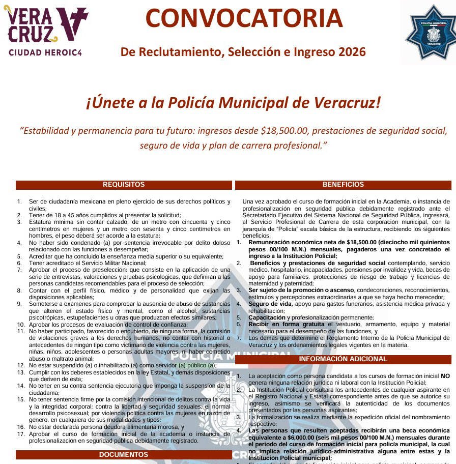 El Ayuntamiento de Veracruz dio a conocer la Convocatoria 2026 para el ingreso a la Policía Municipal de Veracruz, con el propósito de fortalecer las acciones de seguridad y proximidad social en beneficio de la ciudadanía.