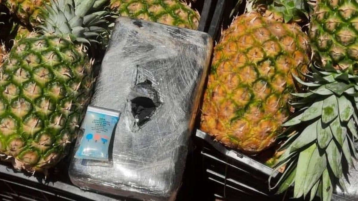 El tractocamión trasladaba toneladas de piña, llevando en su interior un cargamento con más de 300 kilos de aparente cocaína, oculta en rejillas con las piñas.