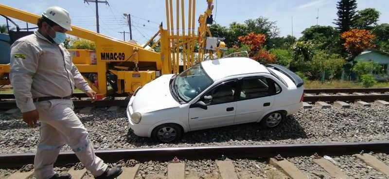 Amatlán de los Reyes, Ver.- Una máquina reparadora de vías perteneciente a Ferrosur impactó a un automóvil que trató de ganarle el paso en el crucero ferroviario ubicado adelante de La Patrona, rumbo a Cuichapa. Por fortuna el conductor del automóvil resultó solo con golpes menores pese a que fue arrastrado varios metros por la pesada máquina.
