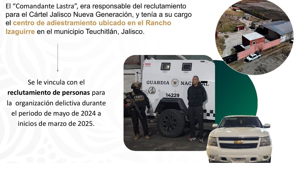 Destacó que a José Gregorio “N”, alias “El Lastra” o “Comandante Lastra”, se le identificó que era mano derecha de Gonzalo “N”, alias “El Sapo”, uno de los líderes regionales en Jalisco, Zacatecas y Nayarit, era responsable del reclutamiento durante el periodo de mayo 2024 a marzo 2025.