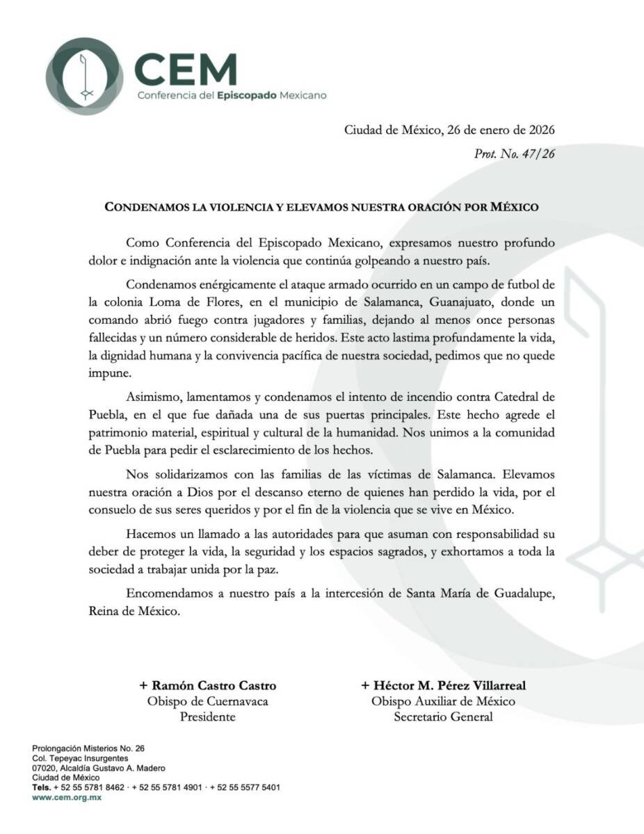 Ciudad de México.— La Conferencia del Episcopado Mexicano (CEM) expresó su dolor e indignación ante la violencia que continúa afectando al país, luego del ataque armado que dejó once personas muertas en un campo de futbol en Salamanca, Guanajuato, y del intento de incendio en la Catedral de Puebla, hechos que, señalaron, reflejan el deterioro de la seguridad y la convivencia social en México.