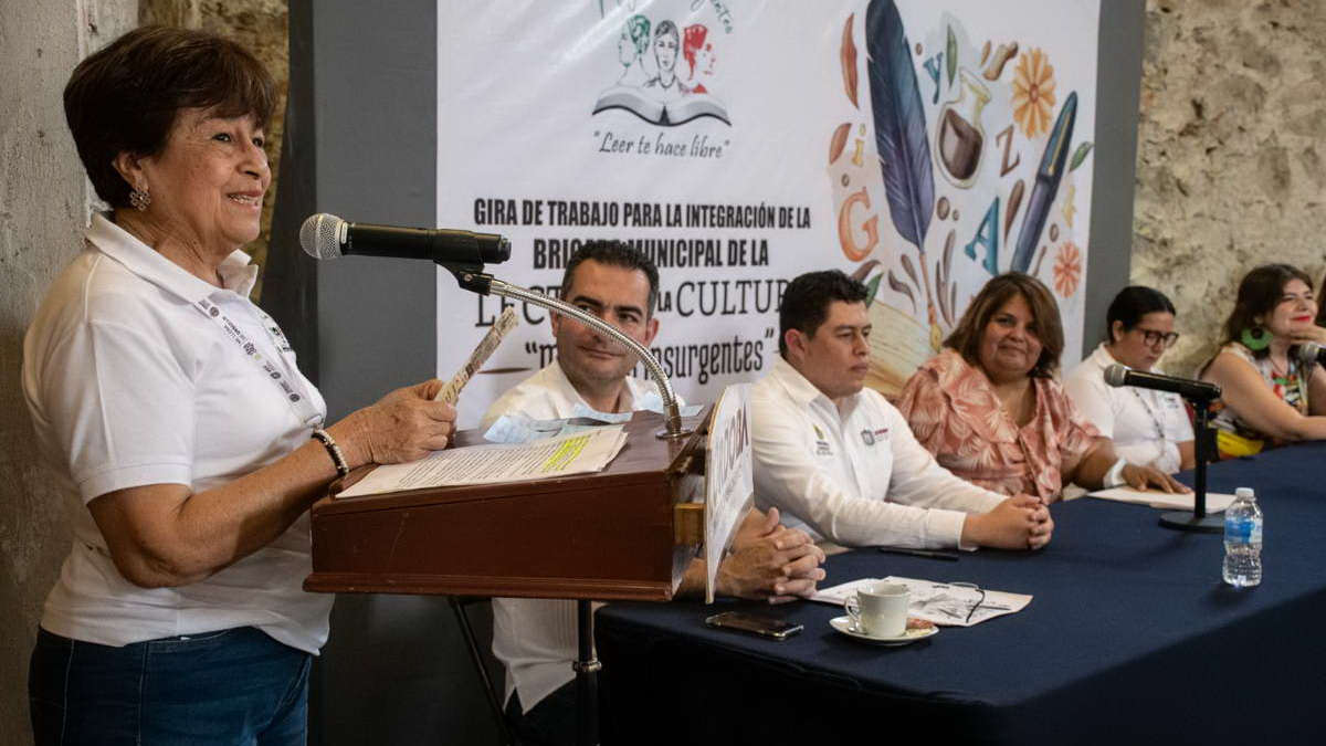 La coordinadora del Programa Español para Todos y de la Brigada de Promoción de la Lectura y la Cultura “Mujeres Insurgentes”, Susana Márquez Pineda, encabezó las mesas de trabajo con los 38 asistentes de municipalidades aledañas, donde habló de las líneas de acción a implementar entre las que destacan libros de la Biblioteca Viajera en calidad de préstamo a las escuelas, libros donados por la brigada a alumnos, así como a padres, madres o tutores durante los talleres, y el seguimiento para la conformación de sus brigadas municipales.