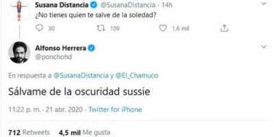 Alfonso Herrera “coquetea” con Susana Distancia y pide que “lo salve de la oscuridad” Alfonso Herrara no perdió la oportunidad de “coquetear” con Susana Distancia, luego de darse a conocer que ... Redacción22 de abril del 2020 Espectáculos