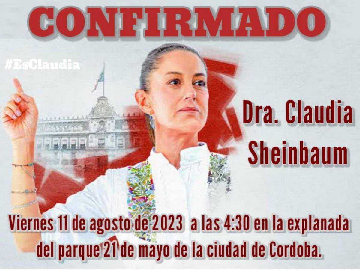 Córdoba, Ver., 11 de agosto de 2023.- Tal como estaba programado, la visita a Córdoba de la aspirante a la Coordinación de la Defensa de la Cuarta Transformación, Claudia Sheinbaum Pardo, se llevará a cabo hoy a las 16:00 horas en la explanada del parque 21 de Mayo.