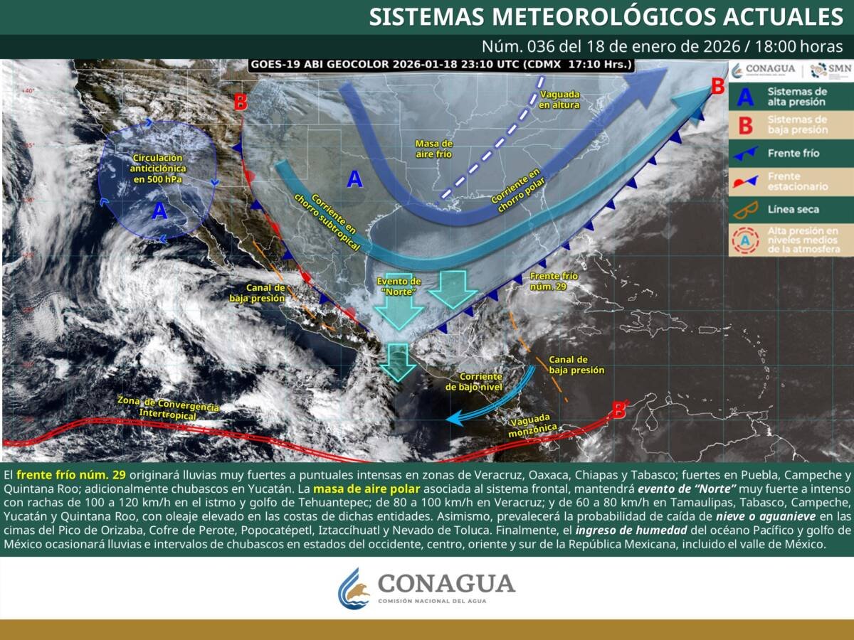 Ciudad de México a 18 de Enero del 2026. Emisión: 18:00h Servicio Meteorológico Nacional, fuente oficial del Gobierno de México, emite el siguiente aviso: LLUVIAS ...