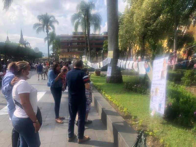 El tendedero instalado en el principal parque de Orizaba, a unos pasos de la catedral de San Miguel Arcángel llevó por nombre “Feliz Día del Padre Ausente”.