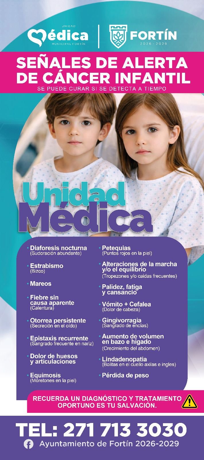 Según las estadísticas de los expertos, en México el cáncer infantil constituye la segunda causa de muerte, por lo que, desde la Unidad Médica Municipal Fortín, se busca promover la detección oportuna para incrementar la posibilidad de recuperar y mejorar la calidad vida de los menores, si se detecta a tiempo hay alta tasa de curación.