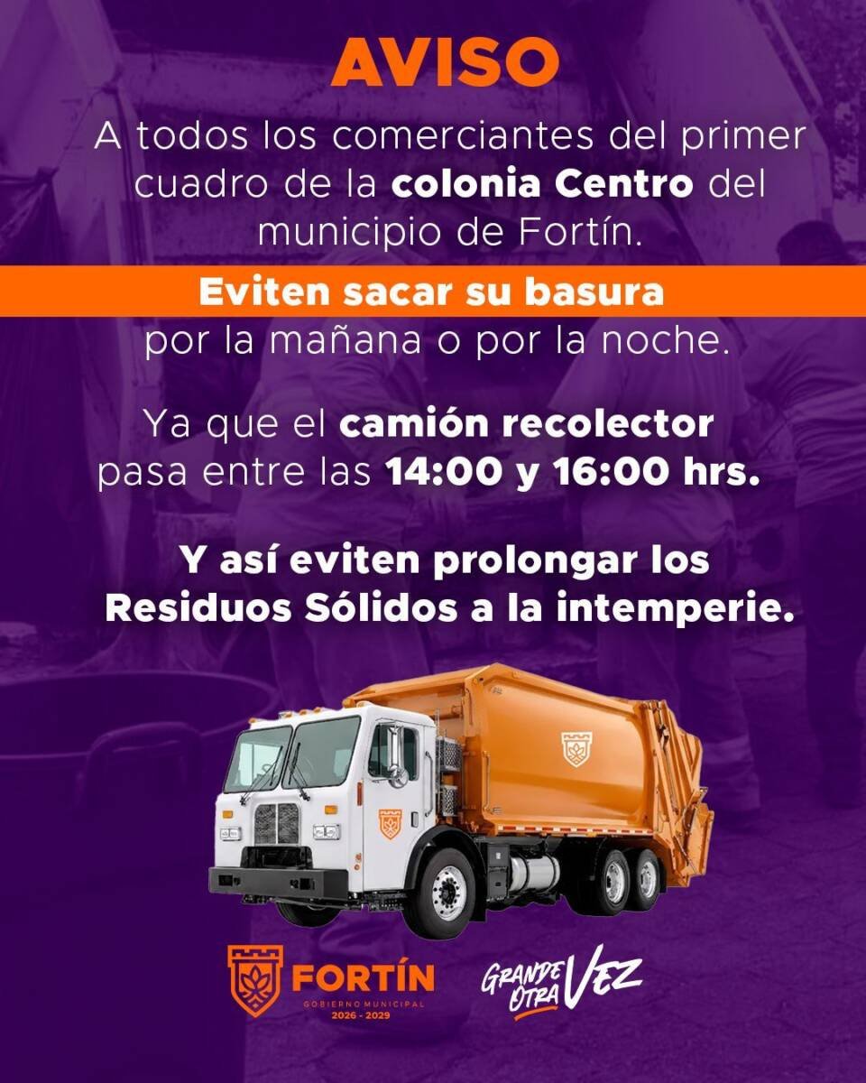 Con el objetivo de mantener la imagen urbana y prevenir focos de infección en el corazón de la ciudad, la Coordinación de Comercio del Ayuntamiento de Fortín, emitió un exhorto urgente a los comerciantes del primer cuadro para que respeten estrictamente los horarios del servicio de recolección de basura.