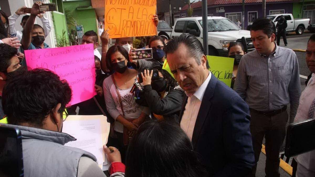Fue minutos después de las 10:00 horas de este martes que el mandatario estatal arribó al Palacio Municipal donde fue abordado por los inconformes quienes le expusieron que sin consultar a la población, mediante Cabildo se aprobó la donación del predio al igual que la reubicación de la escuela.