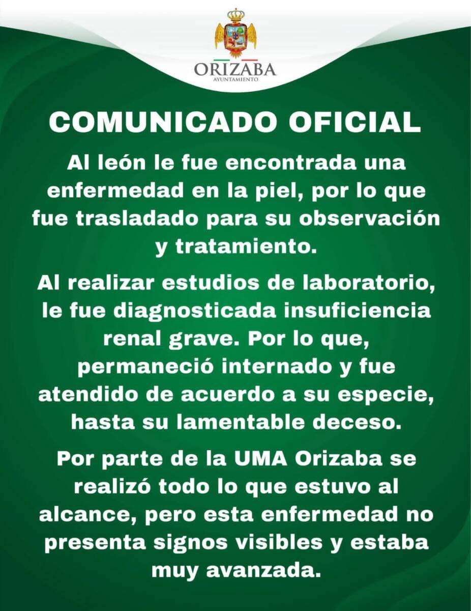“Al león le fue encontrada una enfermedad en la piel, por lo que fue trasladado para su observación y tratamiento. Al realizar estudios de laboratorio, le fue diagnosticada insuficiencia renal grave. Por lo que, permaneció internado y fue atendido de acuerdo a su especie, hasta su lamentable deceso. Por parte de la UMA Orizaba se realizó todo lo que estuvo al alcance, pero esta enfermedad no presenta signos visibles y estaba muy avanzada.”