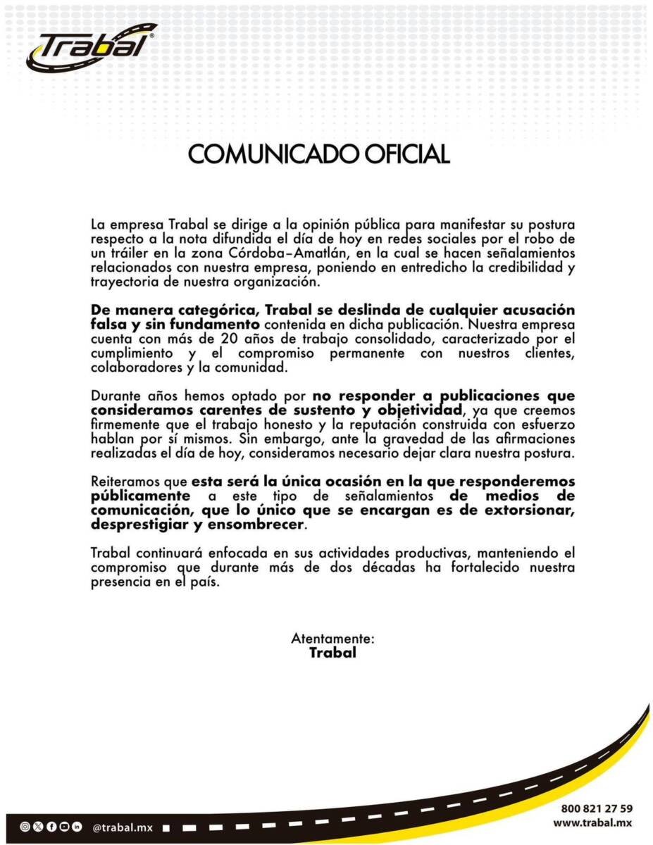 En su comunicado a la opinión pública señala: “La empresa Trabal se dirige a la opinión pública para manifestar su postura respecto a la nota difundida el día de hoy en redes sociales por el robo de un tráiler en la zona Córdoba-Amatlán, en la cual se hacen señalamientos relacionados con nuestra empresa, poniendo en entredicho la credibilidad y trayectoria de nuestra organización.”