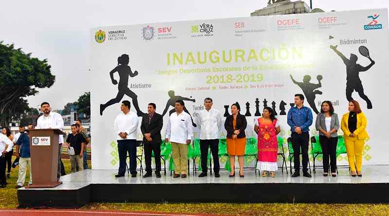 El titular de la dependencia, Zenyazen Escobar García, inauguró los Juegos Deportivos Escolares de la Educación Básica 2019 junto el director del Instituto Veracruzano del Deporte (IVD), David Pérez Medellín.