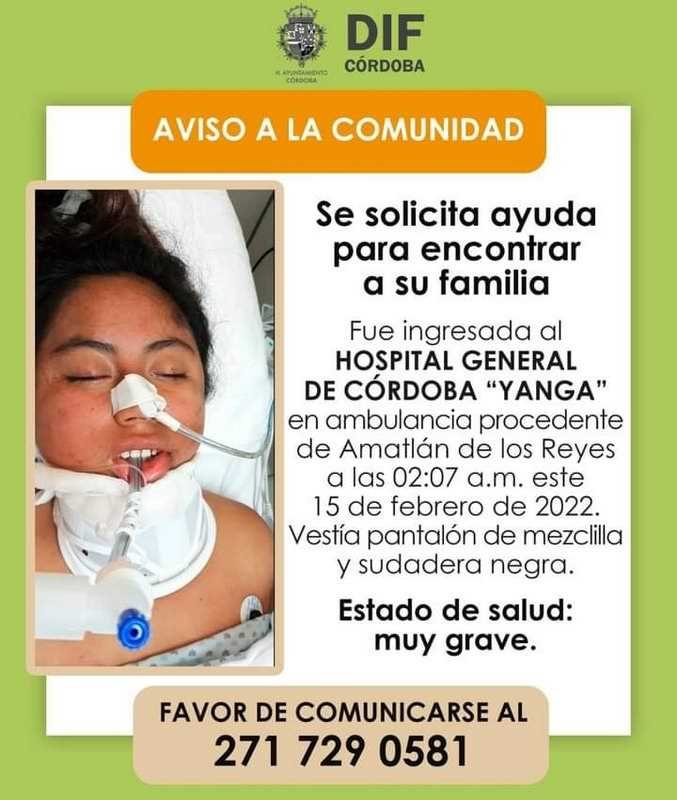 La fémina de entre 25 a 30 años se encuentra en el área de terapia intensiva del Hospital General de Córdoba, presenta trauma de cráneo severo, hematoma intracraneal, fracturas en diferentes partes del cuerpo, al parecer no cuenta con huellas de violencia por lo que se presume pudo haber sido atropellada por un vehículo.