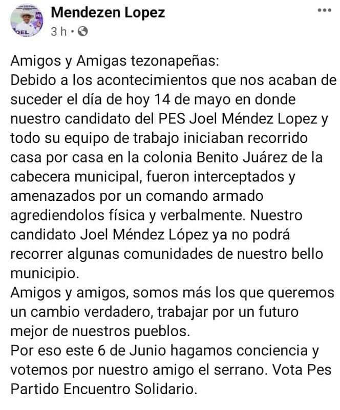 Tezonapa, Ver.- El candidato del Partido Encuentro Social a la presidencia municipal de este municipio de nombre Joel Méndez López fue agredido por un grupo armado cuando realizaba acciones de proselitismo en la colonia Benito Juárez y por redes sociales anunció la suspensión de varias de sus actividades con la finalidad que disminuir los riesgos que enfrenta.
