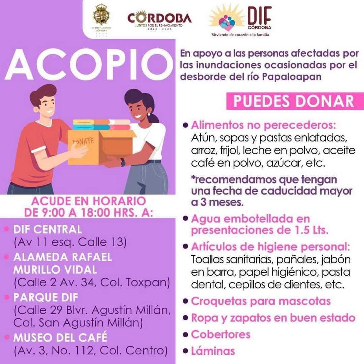 Córdoba, Ver., (17 de septiembre de 2022).-  A partir de este lunes, el Ayuntamiento de Córdoba a través del DIF Municipal habilitará distintos Centros de Acopio en apoyo de los afectados por las recientes lluvias e inundaciones en los diferentes municipios de Veracruz, por lo que la ciudadanía podrá ayudar donando alimentos no perecederos o ropa en buen estado.