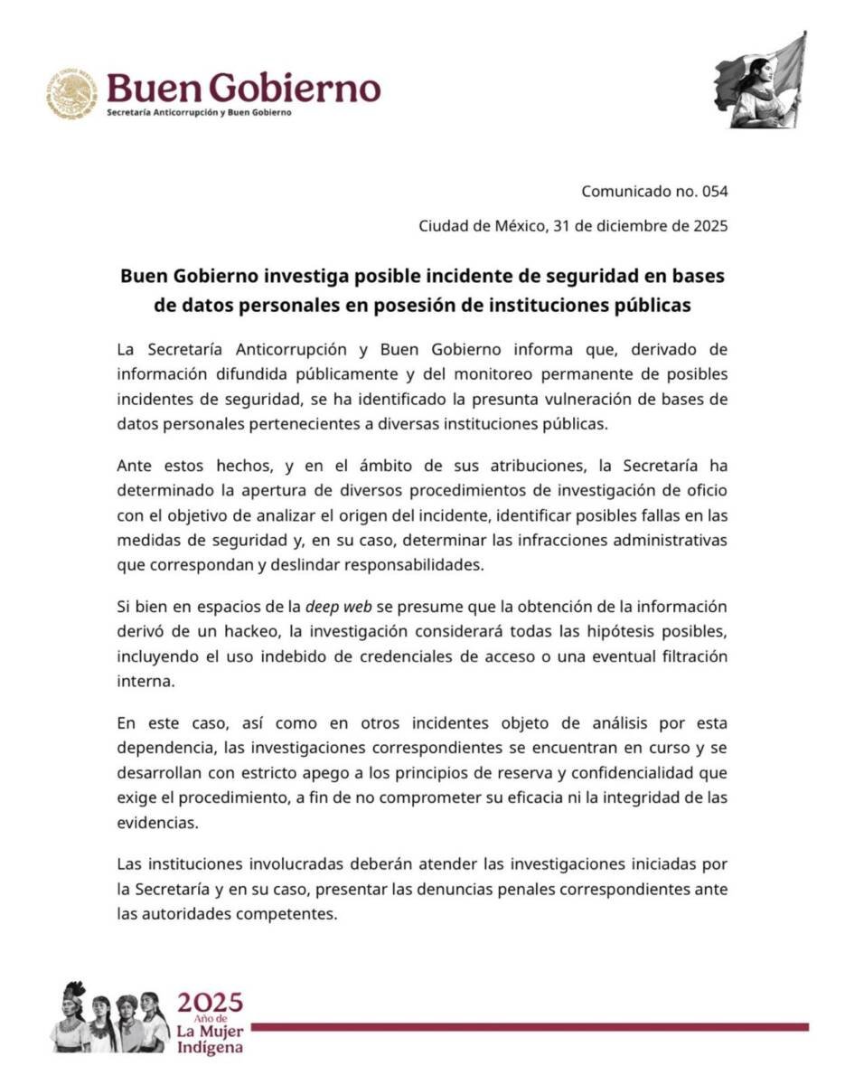 Ciudad de México.- La Secretaría Anticorrupción y Buen Gobierno emitió un comunicado anunciando la presunta vulneración de bases de datos personales pertenecientes a diversas instituciones públicas y difundidas en la Deep Web.