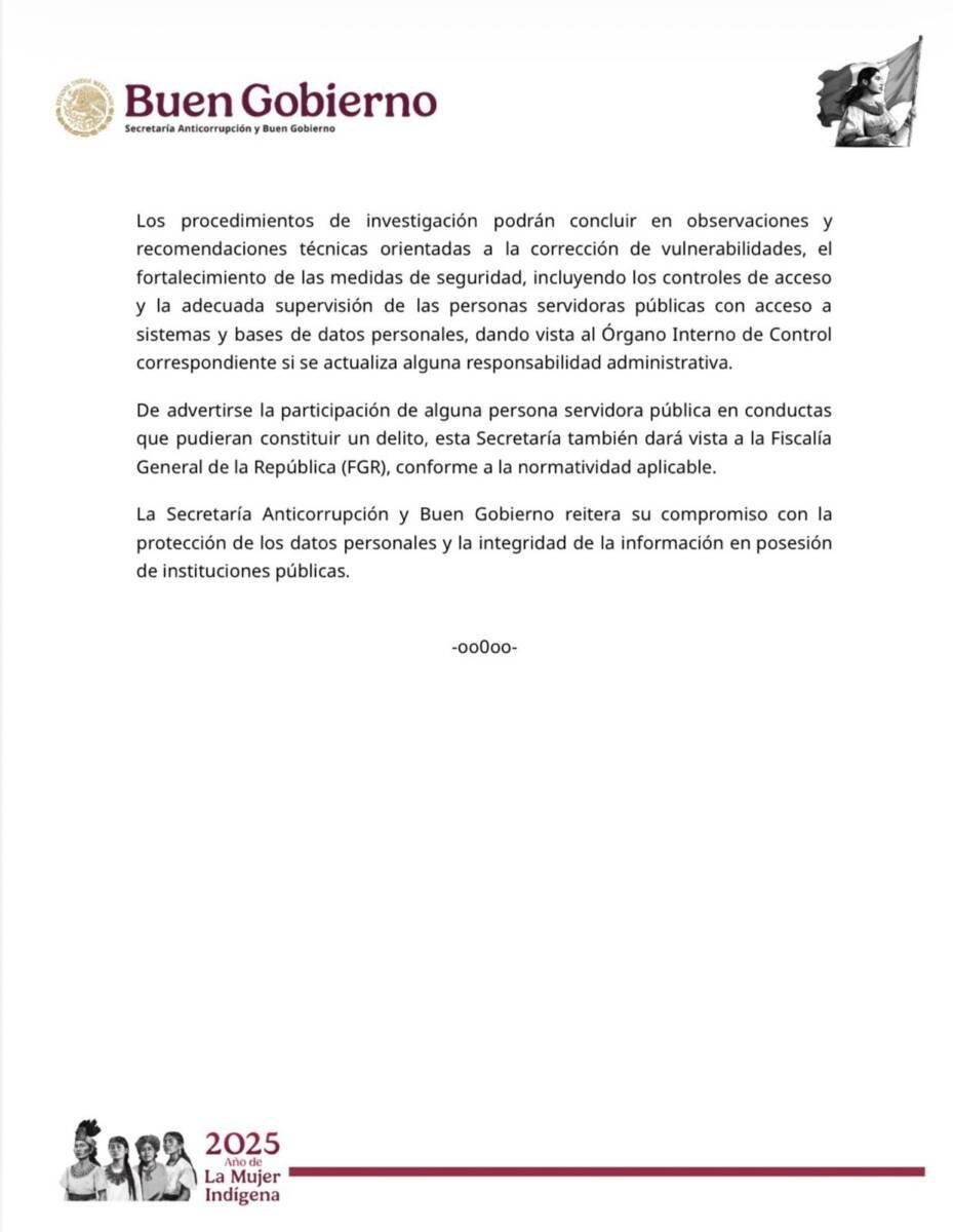 Buen Gobierno anuncia el inicio de diversos procedimientos de investigación de oficio para detectar el origen del incidente, identificar las posibles fallas en sistemas de seguridad que permitieron esto y determinar las infracciones administrativas que correspondan.
