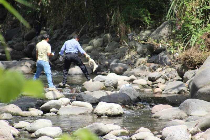 Agentes de la Policía Ministerial recorren el río en busca de más restos humanos que puedan permitir obtener algún indicio de su identidad.