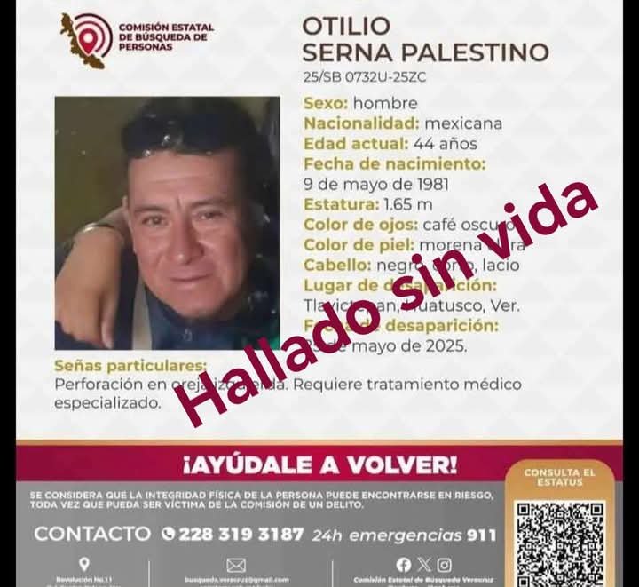 Huatusco, Ver.- Las autoridades informaron que este martes fue localizado sin vida el señor Otilio Serna Palestino, quien había sido reportado como desaparecido desde el pasado domingo 25 de mayo.