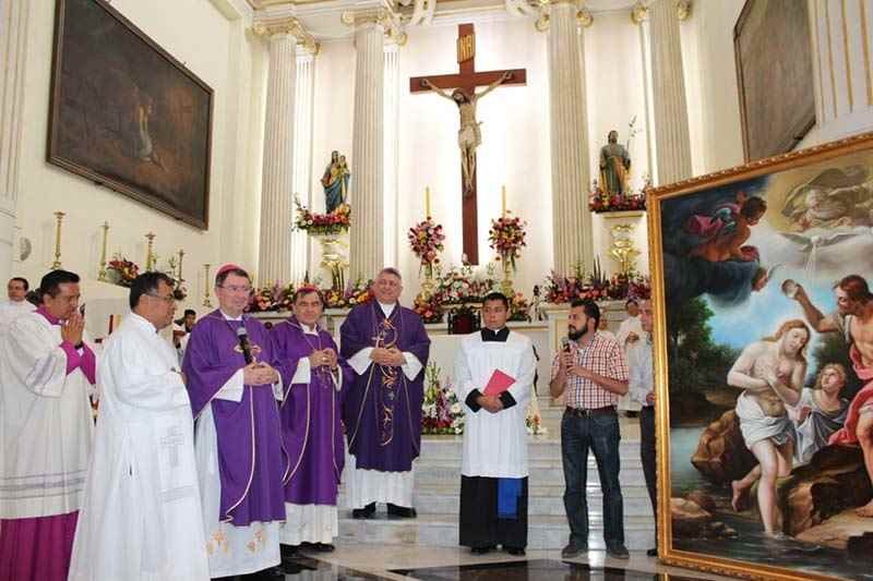 La pintura expuesta en el bautisterio de la iglesia principal de Zongolica, también fue presentada en una Solemne y magna misa en la Catedral de San Miguel Arcángel de la Cuidad de Orizaba realizada en aquel entonces por el Arzobispo Monseñor Cristophe Louis Yunes George Pierre Nuncio Apostólico en México; Monseñor Francisco Eduardo Cervantes Merino Obispo de la Diócesis de Orizaba; Monseñor Eduardo Porfirio Patiño Leal; el presbítero Camerino Cosme Carrillo párroco de la Ciudad de Zongolica en presencia de sacerdotes católicos de la Diócesis de Orizaba, realizando de manera especial la bendición de esta pintura que desde el 27 de marzo de 2016 se encuentra expuesta como imagen principal del bautisterio de la Parroquia de San Francisco de Asís en Zongolica.