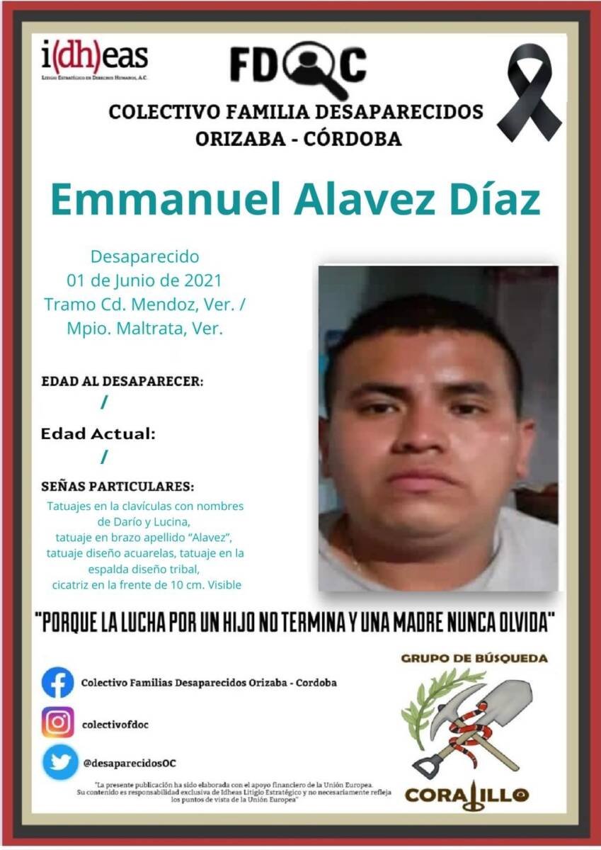 El joven fue reportado como desaparecido el 1 de junio de 2021, tras salir de su domicilio en Camerino Z Mendoza, su última ubicación conocida lo situaba en la zona de Maltrata, donde tiempo después fueron localizados restos humanos que fueron trasladados al Centro de Identificación Genética Forense en Nogales, donde, tras diversos estudios de ADN, se logró confirmar la identidad de Emmanuel.