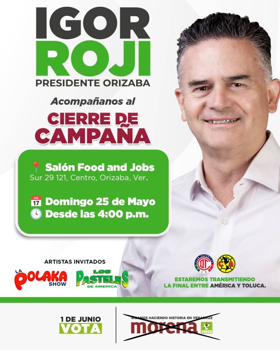 El acto final de campaña se llevará a cabo este domingo 25 de mayo en las instalaciones de Food and Jobs, ubicadas en Sur 29 y Calle Real, un espacio donde el candidato refrendará ante simpatizantes y ciudadanos su compromiso firme de trabajar por un Orizaba más justo, equitativo y próspero.
