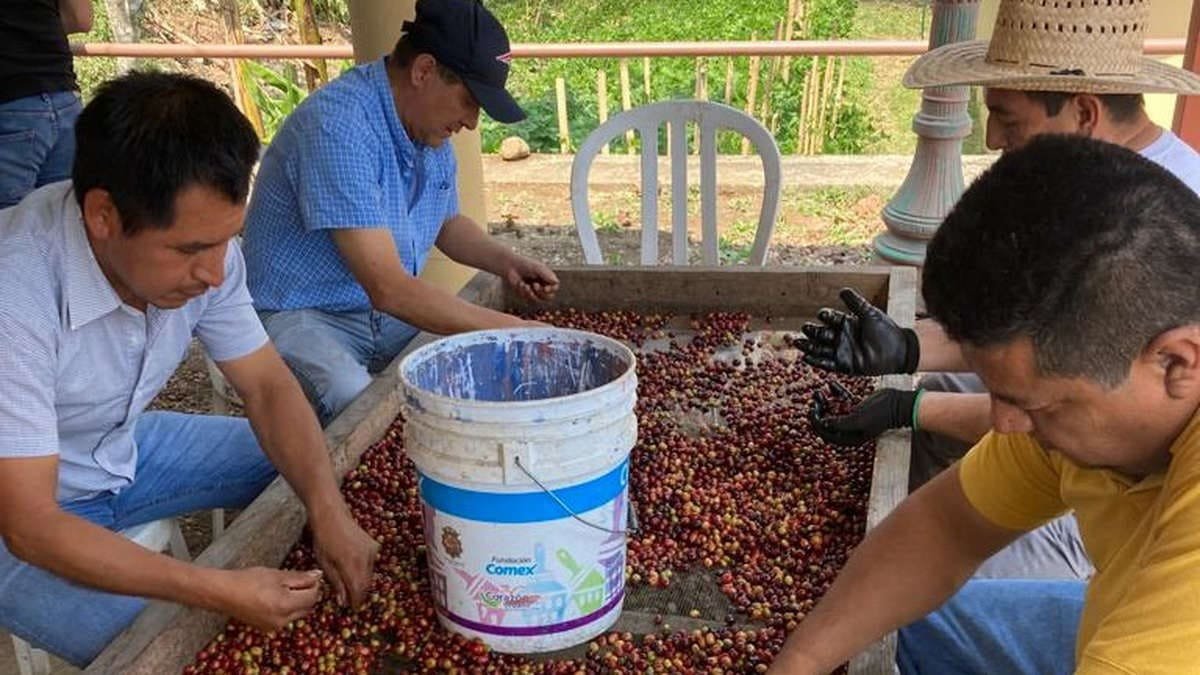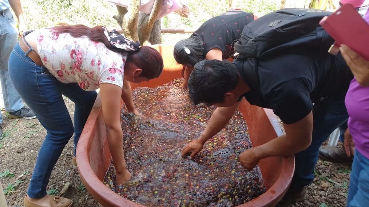 Posteriormente, los asistentes llevaron a cabo la práctica haciendo la selección del café previo al corte, con la finalidad de quitar las impurezas que pudieran estar presentes, para dar continuidad en enjuagar y meter en tambos para permitir la hidromaceración, es decir, la fermentación del grano sin que haya intercambios o malos olores dentro del nanolote, y con ello homogeneizar las temperaturas y tener resultados paralelos.