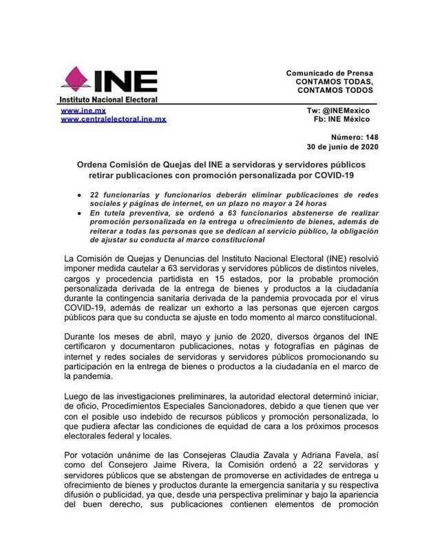 La comisión conformada por las consejeras Claudia Zavala y Adriana Favela, así como del consejero Jaime Rivera, ordenó a 22 servidoras y servidores públicos que se abstengan de promoverse en actividades de entrega u ofrecimiento de bienes y productos durante la emergencia sanitaria y su respectiva difusión o publicidad, ya que, desde una perspectiva preliminar y bajo la apariencia del buen derecho, sus publicaciones contienen elementos de promoción personalizada; es decir, refieren su nombre y cargo, aparece su imagen y los mensajes publicados, en general, son realizados en primera persona.