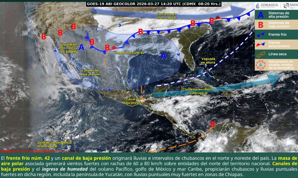 La dirección de Protección Civil Municipal de Veracruz informa a la ciudadanía que, ante el ingreso del frente frío 42 al Golfo de México, se prevén cambios en el estado del tiempo durante este fin de semana, con aumento de nublados, probabilidad de lluvias y viento del norte.