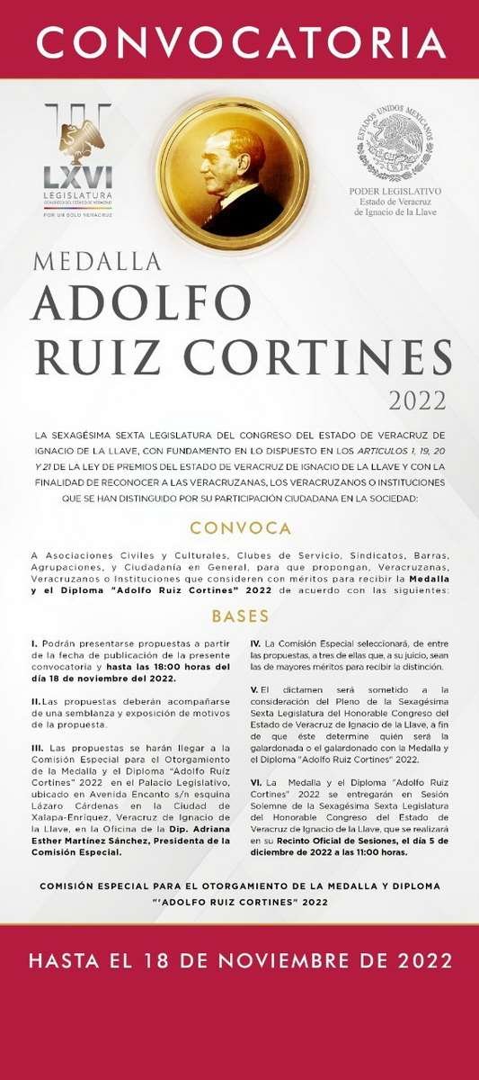 La Medalla y Diploma Adolfo Ruiz Cortines es un Premio que concede anualmente el Congreso del Estado a los veracruzanos que se distingan por sus acciones en la participación ciudadana de la sociedad y aquellas instituciones públicas o sociales que con sus acciones hayan contribuido a mejorar las condiciones de vida de la sociedad.