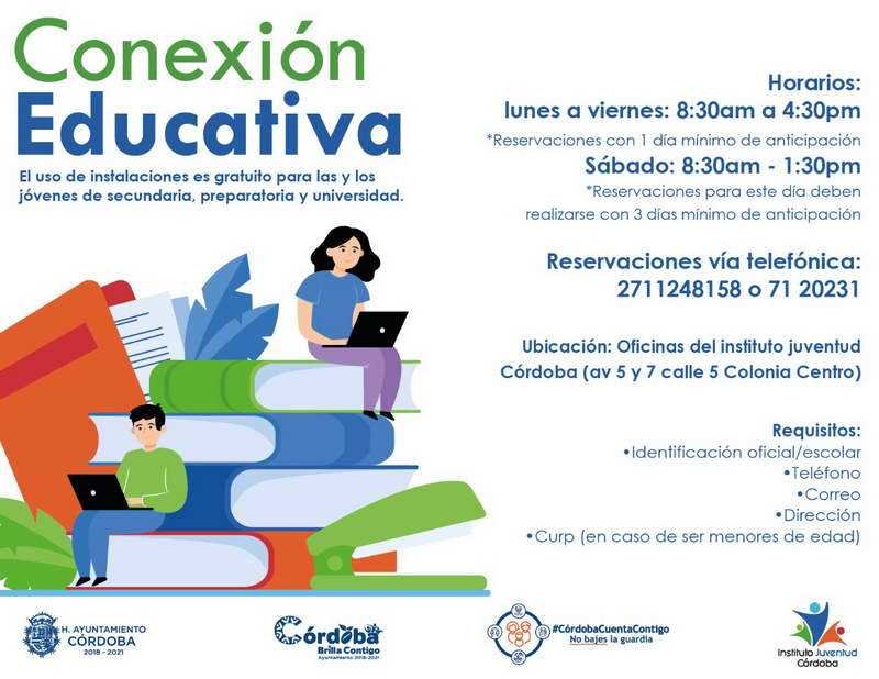 El Instituto Juventud Córdoba (IJC), pone en marcha el programa Conexión Educativa, el objetivo es dotar de herramientas para su formación y educación a las y los jóvenes estudiantes, poniendo a su disposición 45 espacios físicos para recibir sus clases virtuales de secundaria, preparatoria y universidad ante el inicio del ciclo escolar a distancia por parte de la Secretaria de Educación Pública.