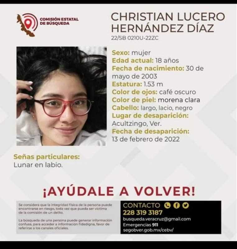 Se trata de Christian Lucero Hernández Díaz de aproximadamente 18 años de edad, quien radica en este municipio, la cual ya fue boletinada por la Comisión Estatal de Búsqueda, en un intento porque sea localizada.