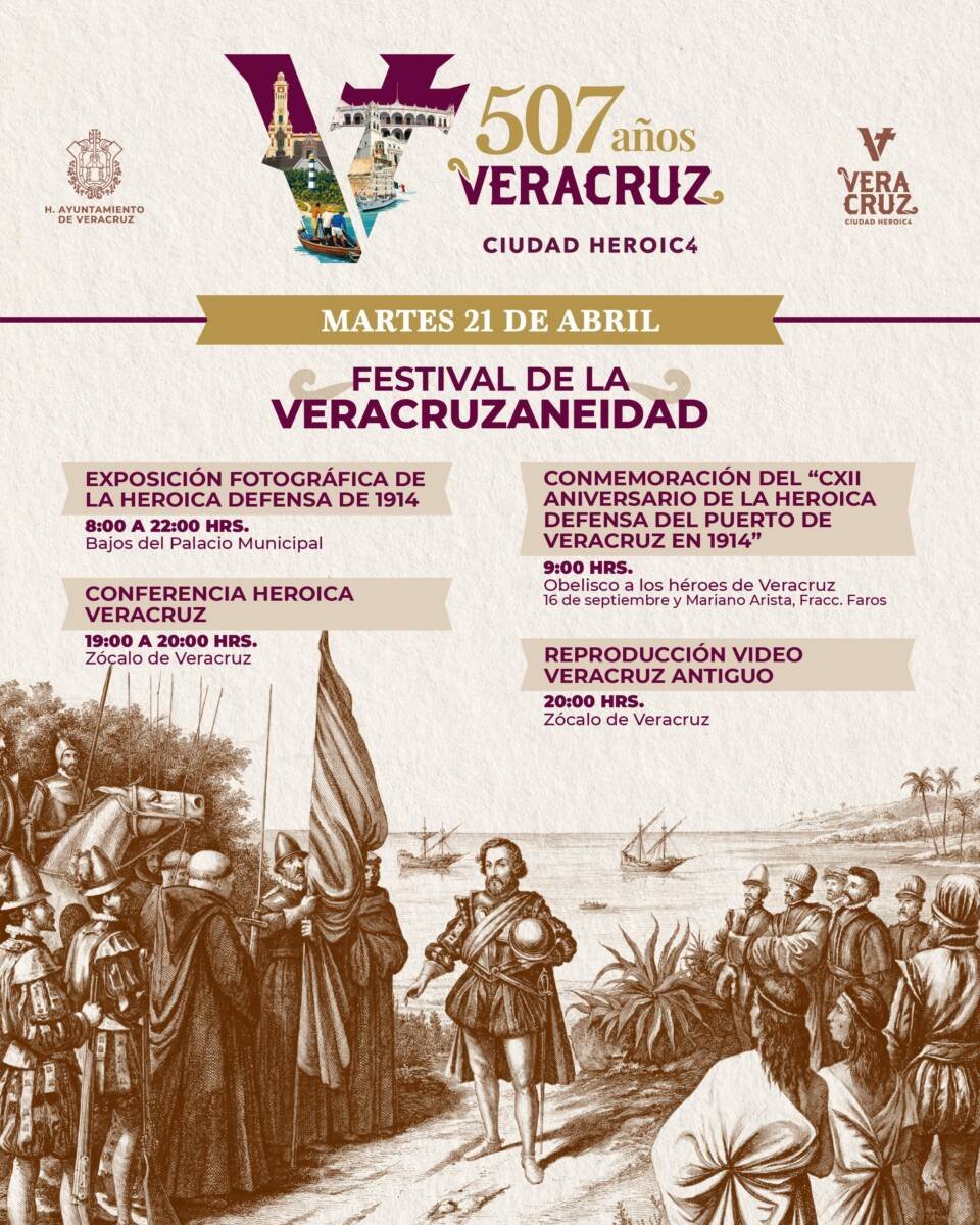 Asimismo, el día martes 21 de abril se realizará una exposición fotográfica de la Heroica Defensa de 1914 en los bajos del Palacio Municipal de 08:00 a 22:00 horas y a partir de las 07:00 de la noche se podrá presencial la conferencia “Heroica Veracruz” y el audiovisual de “Veracruz Antiguo” en el Zócalo de la ciudad.