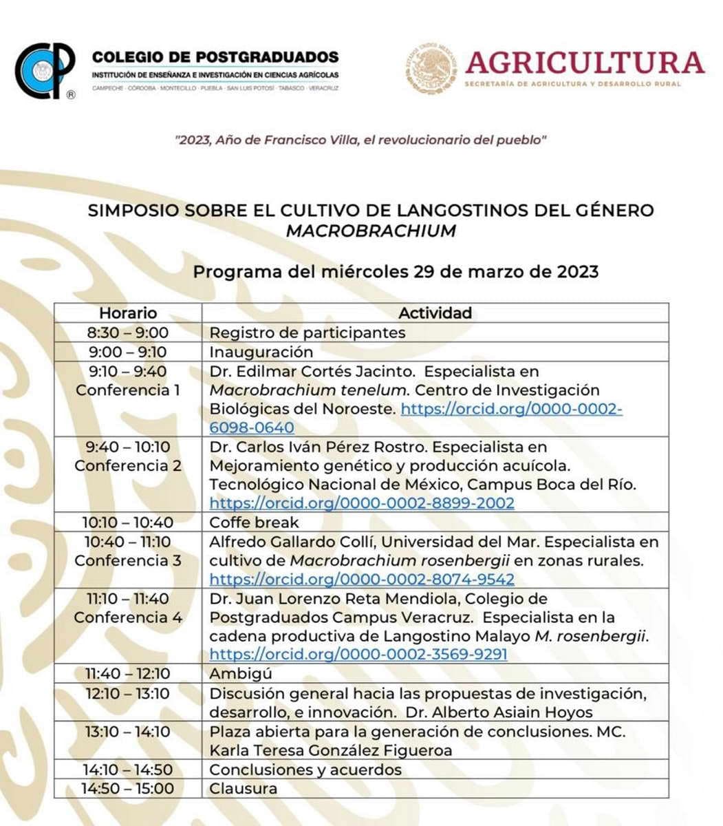 Las conferencias serán impartidas por los siguientes especialistas: Dr. Edilmar Cortés Jacinto, especialista en macrobrachium tenelum, del Centro de Investigación Biológicas del Noreste; Dr. Carlos Iván Pérez Rostro, especialista en Mejoramiento genético y producción acuícola, del Tecnológico Nacional de México, campus Boca del Rio; Alfredo Gallardo Collí, de la Universidad del Mar, especialista en cultivo de macrobrachium rosenbergii en zonas rurales y el Dr. Juan Lorenzo Reta Mendiola, del Colegio de Posgraduados, campus Veracruz, especialista en reproducción de langostino malayo.