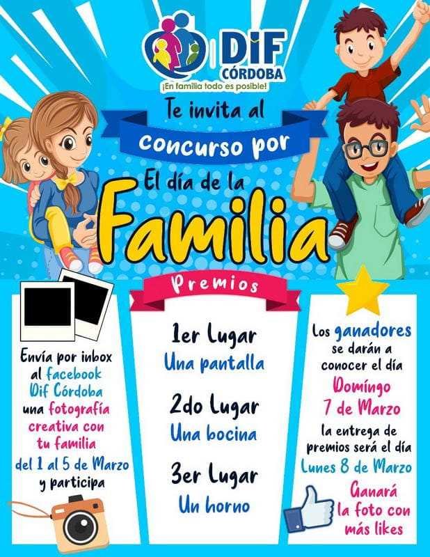Las fotos serán recibidas del 1 al 5 de marzo y ganará la fotografía que tenga más likes en nuestra página de Facebook DIFCórdoba, los tres primeros lugares se darán a conocer el domingo 7 de marzo y recibirán de primer lugar una pantalla, segundo lugar una bocina, y tercer lugar un horno.