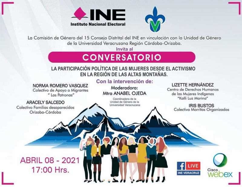 Córdoba, Ver.- La Comisión de Género del 15 Consejo Distrital Orizaba, Veracruz, en Vinculación con la Unidad de Género de la UV de la Región Orizaba Córdoba, tiene el honor de invita al Conversatorio: “La Participación Política de las Mujeres, desde el Activismo en la Región de las Altas Montañas”, contado con la participación del Colectivo de Apoyo a Migrantes “Las Patronas”, Colectivo “Familias desaparecidas Orizaba-Córdoba”, Centro de Derechos Humanos de las Mujeres Indígenas “Kalli Luz Marina” y el Colectivo “Morritas Organizadas”.