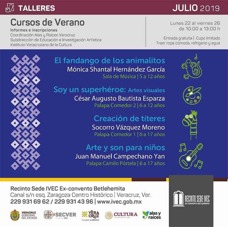 Veracruz, Ver.- El Instituto Veracruzano de la Cultura (IVEC), a través de la Coordinación Estatal de Desarrollo Cultural Infantil “Alas y Raíces” Veracruz, invita a niñas, niños y adolescentes a los cursos de verano gratuitos, del 22 al 26 de julio en el ex Convento Betlehemita, de 10:00 a 13:00 horas. Cupo limitado.