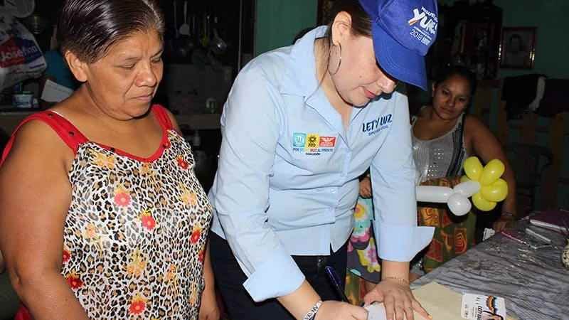 Durante su recorrido casa por casa en la unidad habitacional San Román, Lety Luz firmó en el hogar de la señora Guadalupe Peralta, los requerimientos de la convocatoria por parte del Organismo Público Local Electoral del Estado de Veracruz, para confirmar su participación al debate del proceso electoral 2018.