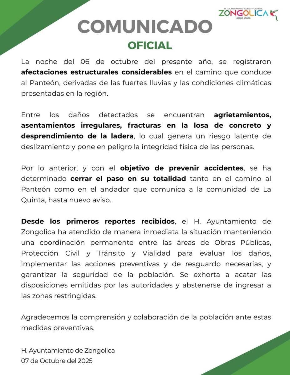 Zongolica, Ver.- Un derrumbe provocado por intensas lluvias ha destruido una porción considerable del camino que conduce al panteón municipal de esta localidad, dejando incomunicados a varios vecinos y generando alarma en la comunidad, que utiliza esta vía para el traslado de sus difuntos.