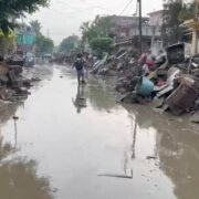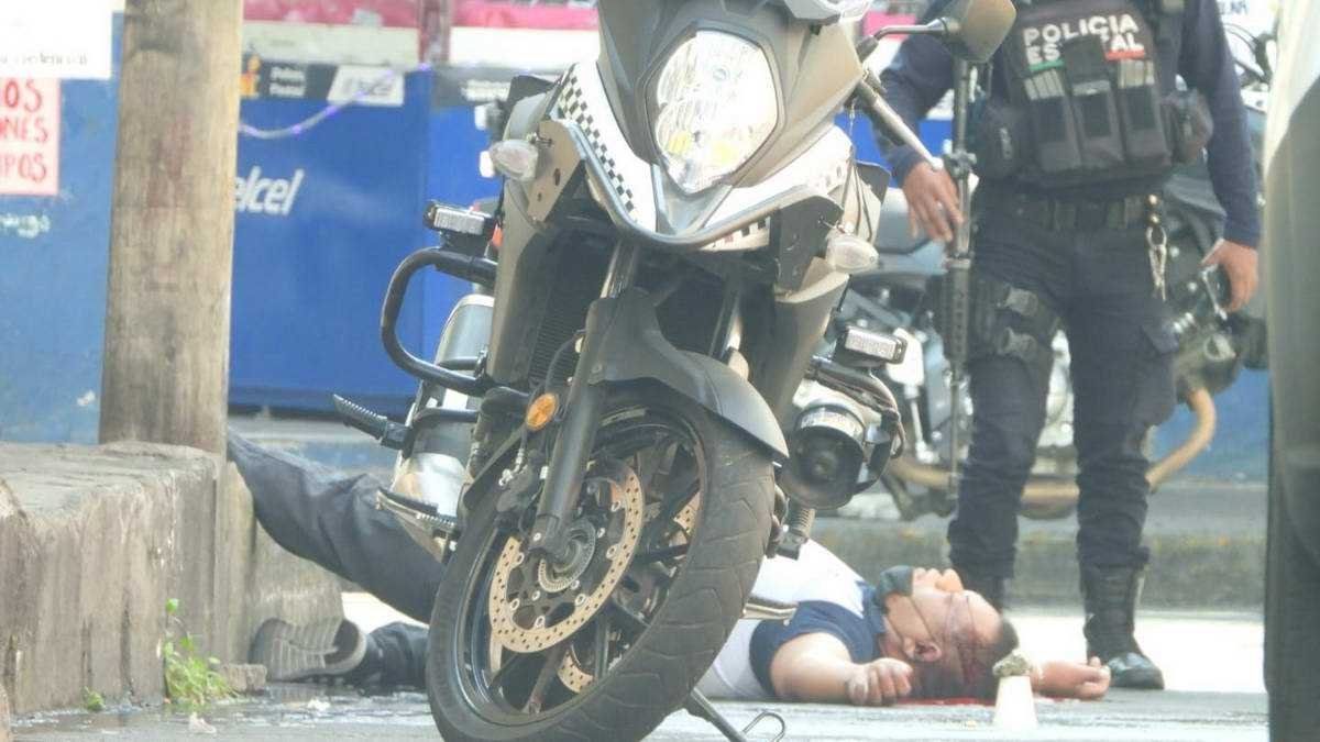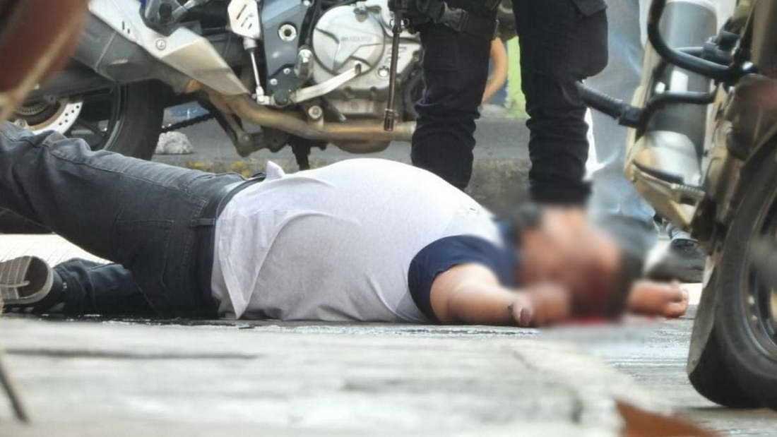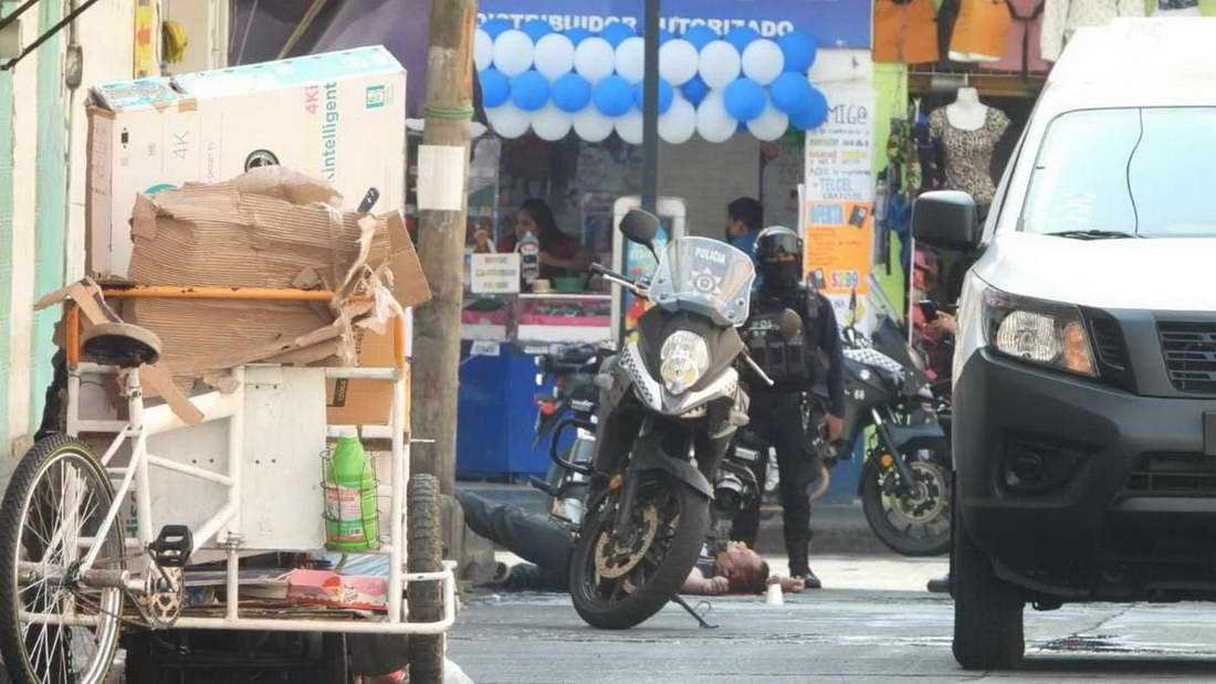 El cuerpo se encuentra sobre la banqueta y viste una playera color blanca y pantalón de mezclilla.