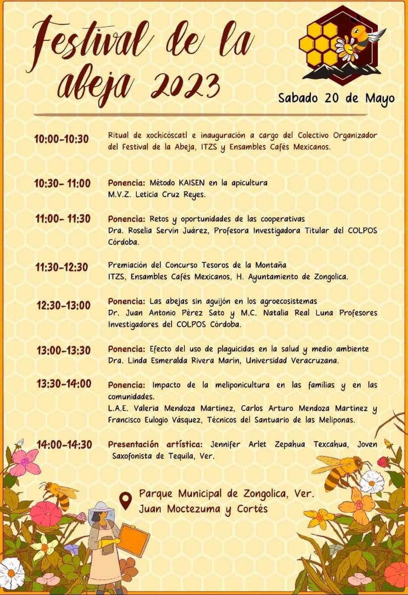 Zongolica, Ver.- Con diversas ponencias y un festiva lleno de artistas y de rituales, el próximo sábado 20 de mayo se llevará a cabo la tercera edición del Festival de la Abeja en el parque Juan Moctezuma y Cortés de Zongolica, para conmemorar el Día Mundial de las abejas, informaron integrantes del Colectivo Organizador.