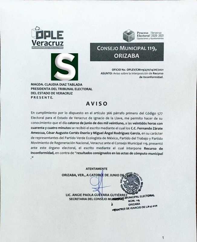 Tras recibir el escrito, la secretaria del Consejo Municipal del OPLE levantó el expediente para acreditar este hecho. En dicho documento, se lee: “En la ciudad de Orizaba, Veracruz, a los catorce días del mes de junio de 2021, con fundamento en lo dispuesto por los artículos 366 párrafo primero del Código Electoral número 577 para el Estado de Veracruz de Ignacio de la Llave, se hace del conocimiento público que el catorce de junio de año en curso, a las veintidós horas con cuarenta y cuatro minutos, se recibió en este organismo, escrito mediante el cual los C.C. Fernando Zárate Amezcua, César Augusto Cortés Osorio y Miguel Ángel Rodríguez García, en su carácter de representantes del Partido Verde Ecologista de México, Partido del Trabajo y Partido Movimiento de Regeneración Nacional, por propio derecho, interpone Recurso de Inconformidad en contra de resultados consignados en las actas de cómputo municipal”.