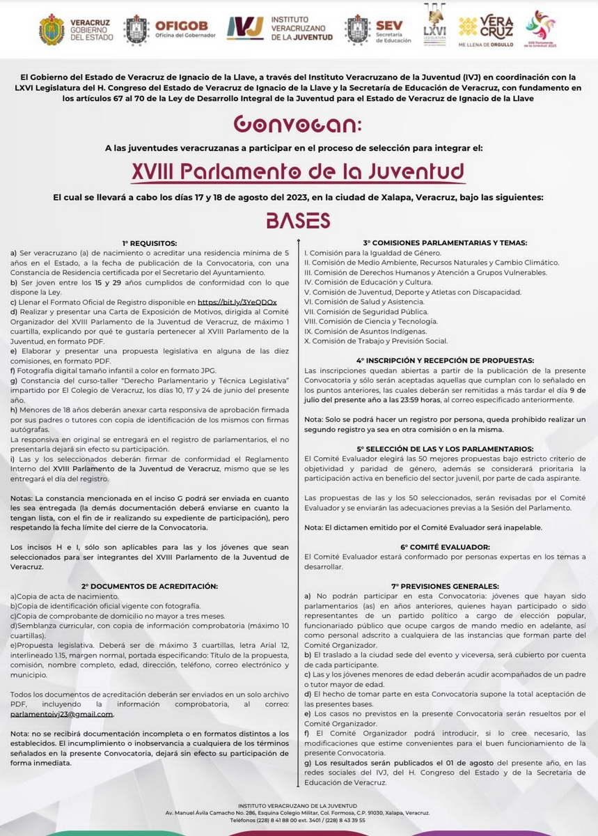 El registro estará abierto hasta el 9 de julio y entre los requisitos para la selección de los 50 parlamentarios destacan ser veracruzano o veracruzana de nacimiento o acreditar una residencia mínima de cinco años en el estado y ser joven entre los 15 y 29 años cumplidos, así como acreditar haber tomado el curso-taller “derecho parlamentario y técnica legislativa” que se impartirá los días 10, 17 y 24 de junio