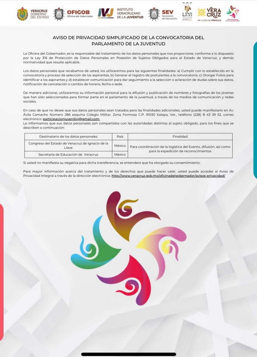 Por último, dijo que la convocatoria detallada se encuentra publica en la siguiente liga https://www.legisver.gob.mx/#! que puede ser consultada a detalle por cualquier joven interesado, que quiera participar en el XXVIII Parlamento de la Juventud Veracruzana a celebrarse este próximo 17 y 18 de agosto.