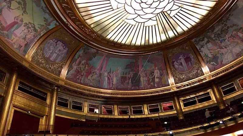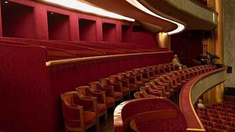La sala principal que cuenta con 1,905 asientos, es roja, oro y gris. Rojos son los asientos y la tapicería, dorados los recubrimientos de madera y gris el mármol de los balcones. La cúpula de cristal está pintada al fresco y representa nubes y rayos de luz.