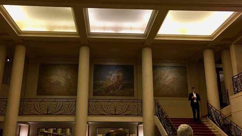 Los muros del vestíbulo utilizan la misma técnica y representan escenas de la mitología. Otra característica arquitectónica innovadora para la época es la ausencia de columnas que obstaculicen la vista del escenario por lo que el espectador cuenta con una visibilidad perfecta.