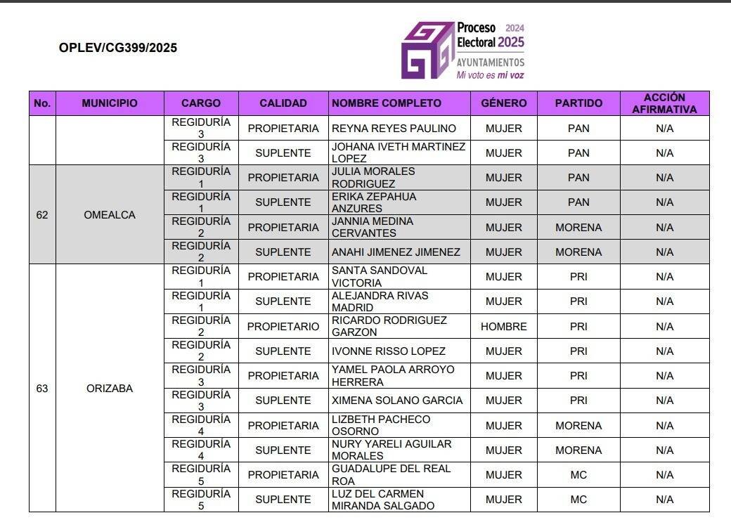 Orizaba, Ver.- El Organismo Público Local Electoral del Estado de Veracruz (OPLE Veracruz) aprobó la asignación de regidurías en 126 ayuntamientos del estado, destacando que, en varios municipios de la región, incluido Orizaba, las mujeres ocuparán la mayoría de los cargos en los cabildos a partir del 1 de enero de 2026.