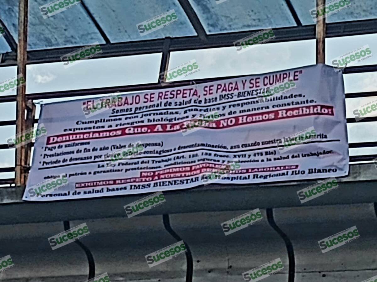 Río Blanco, Ver.- La inconformidad del personal de salud adscrito al programa IMSS Bienestar se hizo visible este viernes frente al hospital de Río Blanco, donde médicos y enfermeras colocaron una lona en un puente peatonal para denunciar el incumplimiento de derechos laborales, pese a haber sido formalmente basificados durante 2024.